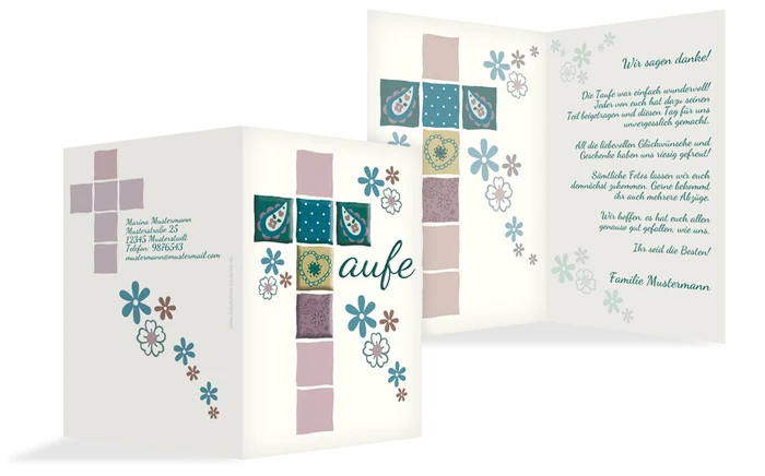 Sagen Sie es doch mit Blumen. Die Taufkarte florales Kreuz präsentiert sich mit einem modernen eleganten Kreuz und vielen wunderschönen Blumen. Ein floraler Gruß der Ihre Dankeskarte zur Taufe erstrahlen lässt.
