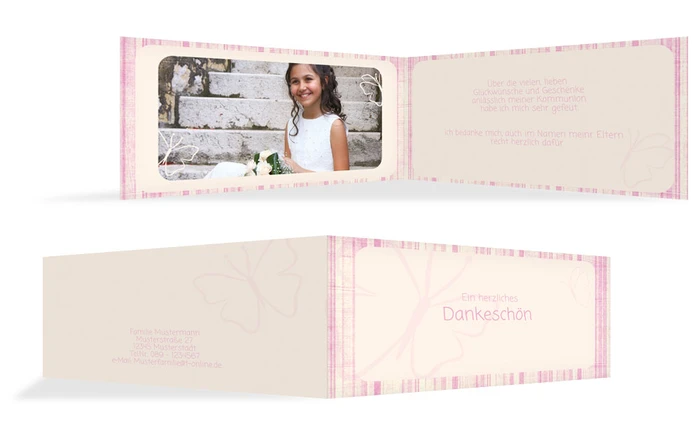 Hauchzarter Schmetterlingsdruck und grafische Rahmenmuster machen diese Dankeskarte „Butterfly2“ zur Kommunion für Mädchen zum bevorzugten Kartenmuster. Noch einen persönlichen Text zum „Danke“ sagen und schon kann der Schmetterling losfliegen.