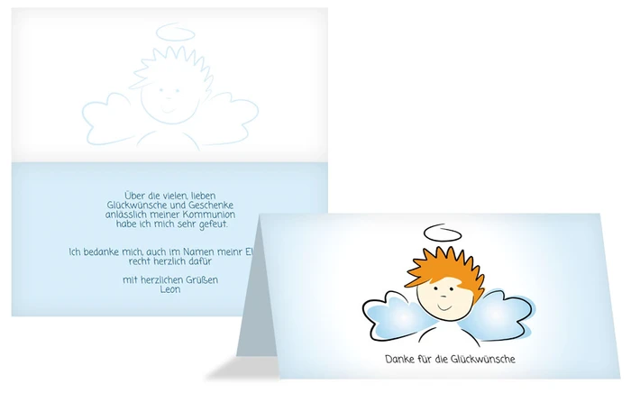 Auch Jungs können Danke sagen mit unserem Engel. Mit dieser Dankeskarte zur Kommunion für kommt ein schützender Engel mit. Lassen Sie Ihre Danksagung von einem kleinen Engel begleitet ihren Gästen überbringen.