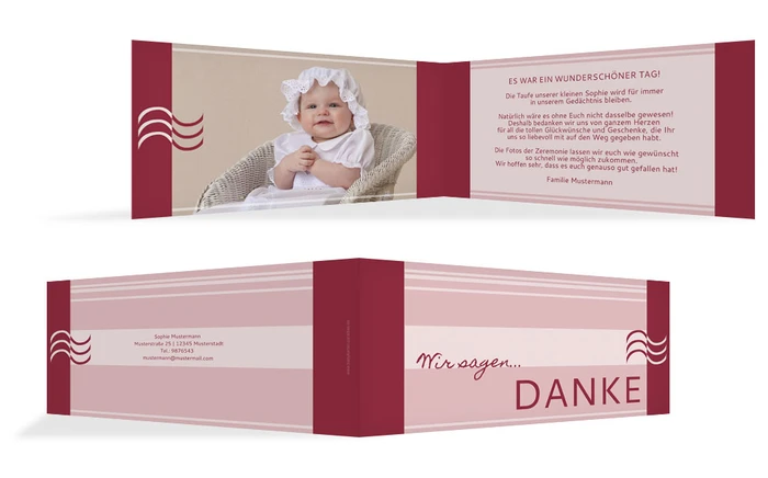 Geschwungen Wellen und Blockstreifen die farblich perfekt aufeinander abgestimmt sind beinhaltet die Dankeskarte zur Taufe Lebenswasser. Das Design besticht durch seine Eleganz und lenkt den Blick auf Ihr Bild und Ihre Danksagung.