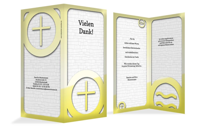 Ein Rahmen der alles zusammen hält. Bei der Dankeskarte zur Taufe Taufsymbolrahmen werden die christlichen traditionellen Symbole von einem Rahmen perfekt zusammen gehalten. Wählen Sie den vorgeschlagenen Text oder geben Sie Ihren eigenen ein.