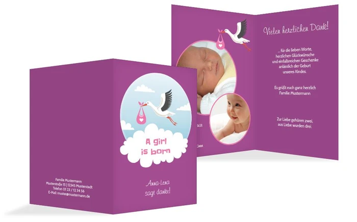 Die Dankeskarte zur Geburt Storch Mädchen mit ihrem wunderschönen Design lässt keinen Zweifel daran, dass sich hier ein kleines Mädchen für all die lieben Glückwünsche bedanken möchte. Fügen Sie noch ein persönliches Foto hinzu.