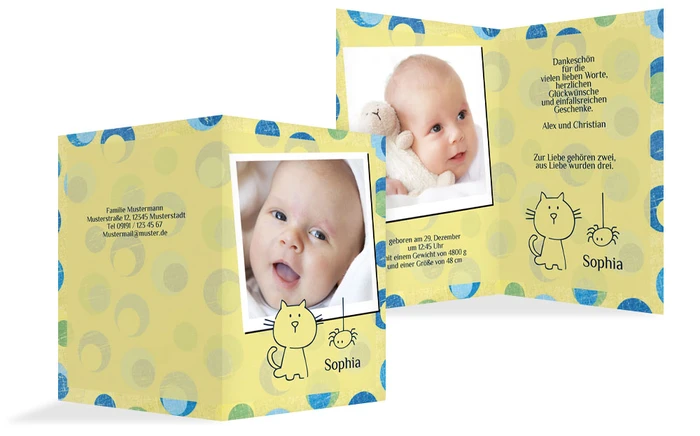 Eine süße kleine Katze ziert die Dankeskarte zur Geburt aus unserer Rubrik Tier. Senden Sie Ihre Danksagung mit dieser niedlichen Karte und begeistern Sie alle Ihre Lieben. Fügen Sie der Karte noch ein persönliches Foto hinzu.