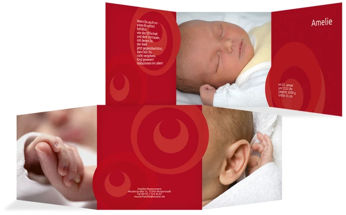Die Geburtskarte Kreise präsentiert sich in einem ansprechenden modernen Design. Fügen Sie der Karte einen eigenen Text sowie Ihr persönliches Foto hinzu um das Design abzurunden und wählen Sie Ihre Wunschfarbe.