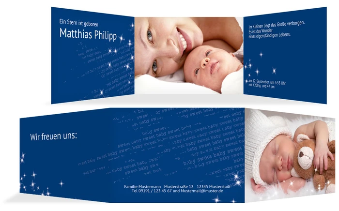 A Star is born. Zeigen Sie das mit dieser Geburtskarte aus der Kategorie Herzen und Sterne. Wählen Sie nicht nur Ihre Wunschfarbe sondern fügen Sie auch noch ein persönliches Foto hinzu. Mit Ihrem eigenen Text runden Sie die Karte ab.