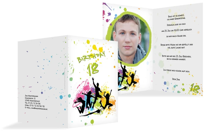 Endlich 18. Das muss natürlich gefeiert werden. Wählen Sie daher die Einladungskarte zum Geburtstag für Jugendliche bunte Party 18. Ein fröhliches farbenfrohes Design lässt die Fotokarte strahlen. Sie bietet genug Platz für Ihr persönliches Bild.