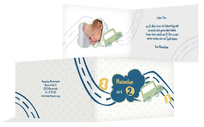 Schon wieder ist ein Meilenstein geschafft. Zeigen Sie die Fortschritte Ihres Geburtstagskindes auf der Lebensstraße mit dieser Geburtstagseinladung für Kleinkinder. Fügen Sie Ihren persönlichen Einladungstext hinzu.