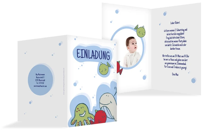 Die Geburtstagseinladung für Kleinkinder Unterwasserwelt zeigt sich mit fröhlichen Tieren die sich schon auf ihre kleinen und großen Gäste freuen. Fügen Sie Ihr persönliches Foto des Geburtstagskindes zur Fotokarte hinzu.