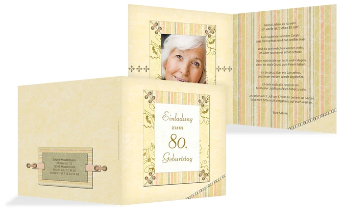 Die Einladungskarte zum runden Geburtstag, Nostalgie 80, verbreitet ein nostalgisches und zugleich sehr modernes Flair. Im Innenteil der Fotokarte finden Sie noch genug Platz für Ihr persönliches Foto.