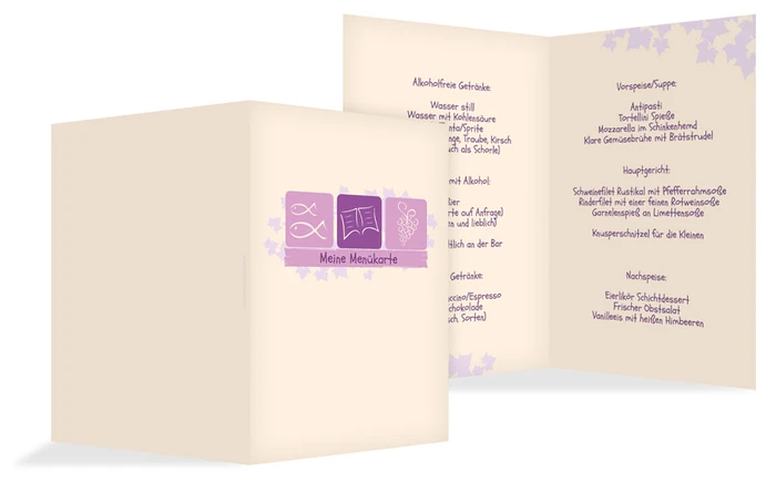 Ein neues Blatt im Leben des Konfirmanden. Diese Symbolik signalisieren Sie mit der Menükarte zur Konfirmation Blatt. Auch im Inneren finden Sie die Symbolik die perfekt Ihr Menü zur Konfirmation untermalt.