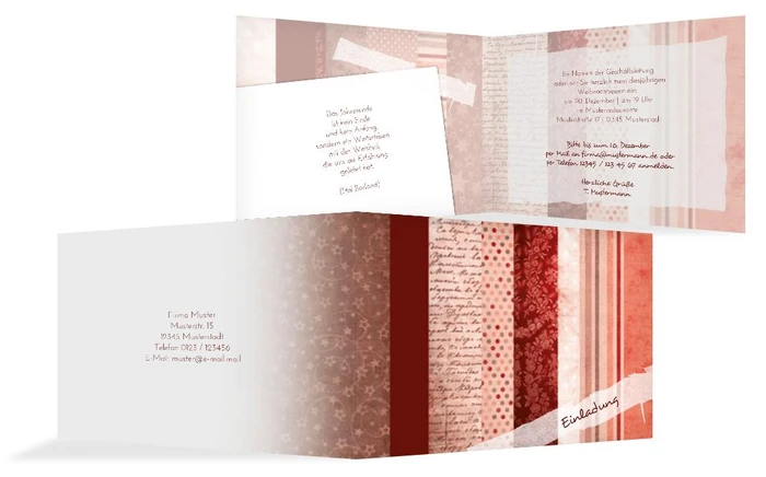 Geschenkpapier erinnert an Weihnachten, Bescherung und besinnliche Stunden. Vermitteln Sie dies Ihren Kunden mit der Einladungskarte zur geschäftlichen Weihnachtsfeier. Fügen Sie im Innenteil noch Ihren persönlichen Text hinzu.