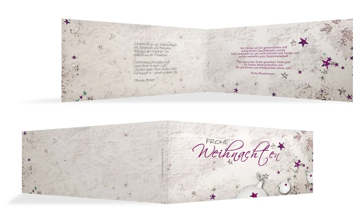 Aufwendig gestaltet Weihnachtsgrußkarte für Ihre geschäftliche Verwendung. Die Textkarte Sternenstaubt hat ein klassisches Design das sehr edel und aufwendig wirkt. Fügen Sie der Karte noch einen persönlichen Text hinzu.